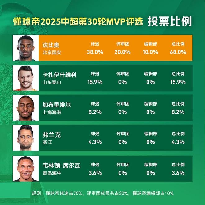正是最后一粒进球,帮助法比奥在一场隔空的“京鲁德比”中以一球之差击败卡扎伊什维利,收下2025中超赛季金靴。最终,综合球迷投票、评审团投票、编辑部投票三部分,法比奥以68%的得票率,大幅领先其他候选,当选中超第30轮MVP。