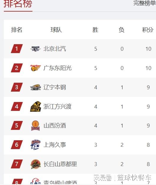 目前,积分榜榜首属于北京队,他们已经取得了5胜0负的战绩,以一波5连胜,独占鳌头。广东队则紧跟其后,他们这一轮比赛的对手是广州队,广东队最终以93-85击败了广州队,成功拿下赛季第5胜。凭借着这一波5连胜,广东队继续紧追北京队,排在积分榜第2名。值得一提的是,截止到目前,CBA全联盟中,也就只剩下北京队和广东队,他们暂时保持不败金身,还没有输过球。排在积分榜第三名的是辽宁队,作为CBA传统强队,辽宁队本赛季阵容实力虽然下滑,不过,新赛季开赛5轮,辽宁队的表现还是非常不错,基本稳居积分榜前四名。目前,辽宁队以4胜1负的战绩,排在积分榜第3名。而他们的老对手广厦,他们这一轮比赛则以19分的优势击败了福建队,将战绩提升到了4胜1负,暂时排名积分榜第4。目前,CBA积分榜前四名排名变动还是比较大,不过,前四名的球队,他们的整体实力,还是比其他球队强一点。山西队这一战面对同为黑马的同曦队,他们并没有给对手任何机会,球队最终以26分的巨大优势击败对手,送给对手一场大败。而在拿下同曦队以后,他们的战绩也变成了4胜1负,球队排名上升到积分榜第5名。积分榜第6名则是上海队,他们这一轮比赛20分大胜浙江队,拿下了新赛季最为酣畅淋漓的一战。凭借着这一战,他们的战绩变成了3胜2负。而积分榜第7名则属于吉林队,上一轮比赛他们还排在积分榜第3。第8名则属于青岛队,他们的战绩是3胜1负。排在积分榜第9的是宁波队,他们的战绩是2胜3负,而紧随其后的是北控队,他们最近状态欠佳,接连输球后,球队战绩也变成2胜3负,排在积分榜第10位。CBA积分榜第11名则属于同曦队,这一轮26分惨败后,他们的战绩变成了2胜3负,胜率已经不足5成了,黑马成色有待检验。而CBA季后赛守门员则是深圳队,截止到目前,他们的战绩是2胜3负,排在积分榜第12名。排在积分榜第13名的是新疆队,他们的战绩是2胜2负。浙江队这一战输给上海队以后,他们的战绩变成了1胜4负,球队排名也下滑至积分榜第14名。而排在积分榜第15名则属于广州队,他们的战绩是2胜2负。第16名则属于福建队,他们的战绩是1胜4负。积分榜第17名则是山东队,他们的战绩是2胜2负。江苏队这一战赢球后,他们终结了连败纪录,以1胜4负,排在积分榜第18名。至于天津队和四川队,他们则遭遇5连败,暂时还没有赢球。附:CBA积分榜最新排名1-5:北京、广东、辽宁、广厦、山西6-10:上海、吉林、青岛、宁波、北控11-15:同曦、深圳、新疆、浙江、广州16-20:福建、山东、江苏、天津、四川相关资讯