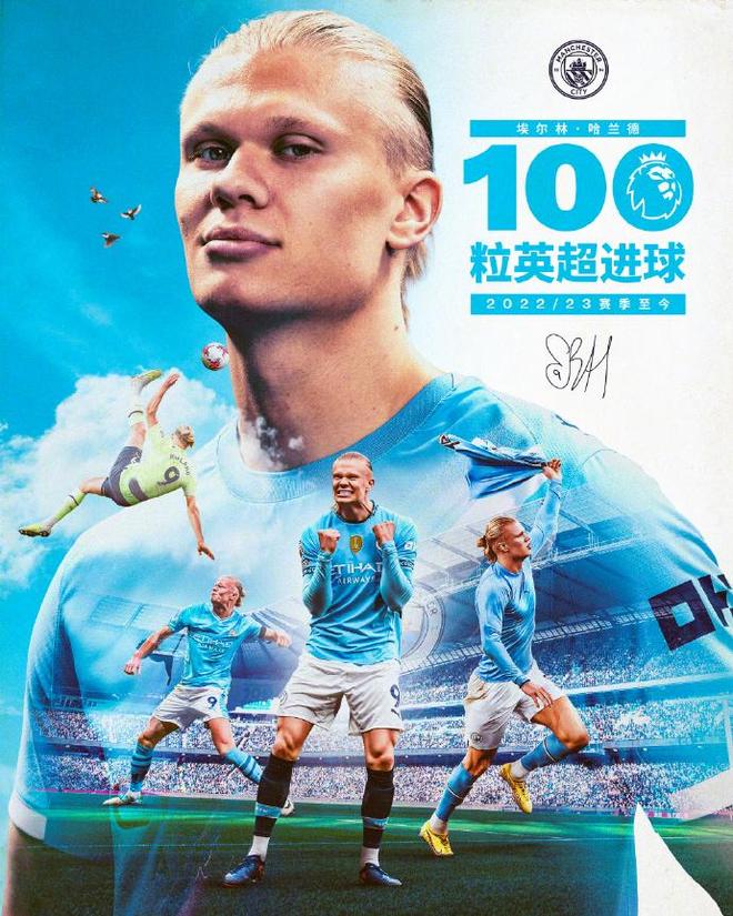 破门之后,哈兰德迎来了里程碑时刻,就是收获个人英超第100球,成为了33年史上最快达成英超百球的球员。