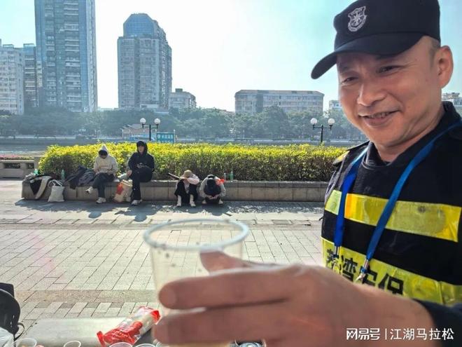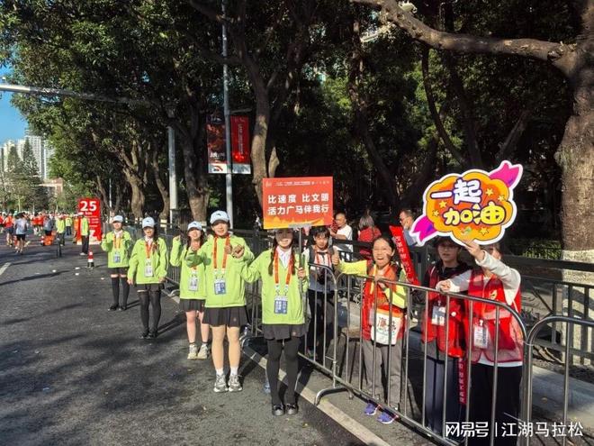 广州市民的热情,表现方式五花八门,多是街坊式的。当进入海珠区后,从25K到27K,赛道旁全是学生加油点,孩子们稚嫩的声音,是广马最动听的旋律。而当进入荔湾区时,又换了种风格,有无数的私补,市民们端着杯子、盘子,将饮料、食品往你手里塞。